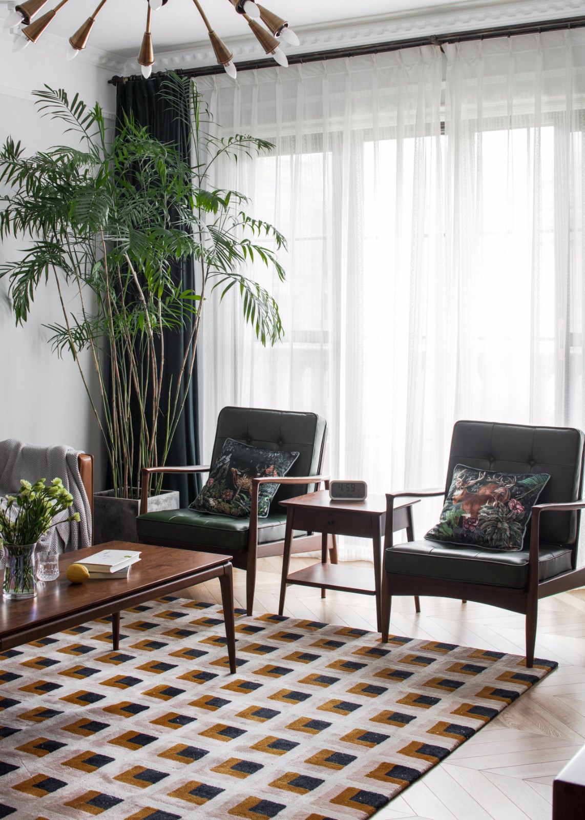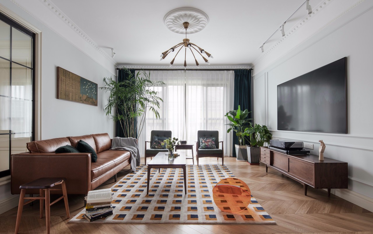 客廳大體是一家三口最長活動場所,這個區域我總體采用的功能性和美觀性結合的方式。 整體色調的統一:整體以胡桃實木的顏色做總色調,從胡桃實木的茶幾到胡桃木的電視柜,再到棕色調的真皮沙發,最后再是一塊長方形的大地毯,做幾個顏色(淺白+棕色+黑色)的重疊,與整個空間所有顏色進行呼應。房主很喜歡夏威椰,因為有竹的氣質,因此它別名也叫夏威夷竹子。濃綠的色彩,茂密的枝條,富有光澤的綠葉傳遞給人一種欣欣向榮的精神氣。它能通過呼吸微調節空氣環境,吸收房中甲醛等揮發性物質。從風水上來講,它放在柱子下面有去煞氣之說。