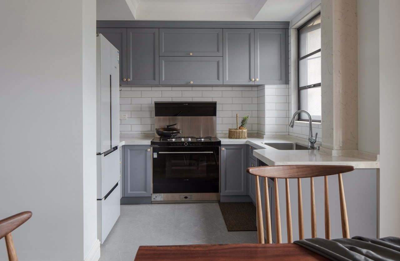 因廚房原來的面積本來就較小,為了改善這個問題,我們還是采用了開放式廚房。整個區域與餐廳區域結合,這里不做區隔,方便媽媽做菜的時候,可以和餐廳的人進行互動。 當然,開放式廚房,有一個小建議,因為炒菜油煙的問題,建議購買大功率吸油煙機。房東買的集成灶,既節省空間,也方便使用。因為收納空間足夠,所以平常不使用的時候,臺面也可以保持整潔如新。