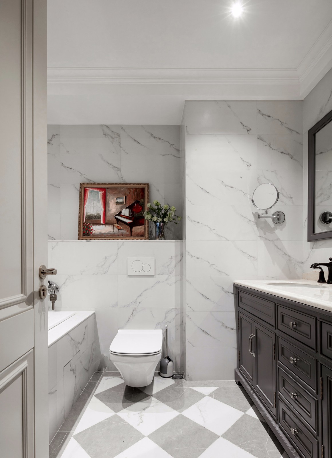 主臥的衛生間滿足了房東的要求,浴缸+梳洗臺+儲物柜+馬桶全部都有。因為在主臥,可以滿足泡澡需求而不被打擾,大概牙醫日常用來放松的場所。 墻面和浴缸表面均采用同樣花紋大理石,不規則的灰色紋路隨意點綴,任意而妄為;地上的大理石采用菱形灰白大理石,與墻體做呼應。墻上的裝飾畫,我個人很喜歡,使整個使用空間格調迅速提高。