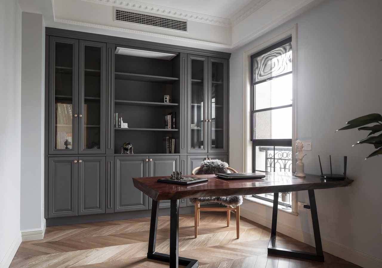 書房空間開放之后,光線充足,空間自由,全實木材質的定制書桌書架,搭配原木色的椅子,十分有質感。 這大概是房東的私人空間,墻面的部分做了櫥柜,方便擱置書籍和小禮物的地方。顏色調性和廚房櫥柜保持了一致。 書桌買了簡易型又文藝的桌子,甚至它可以搖身一變,變成茶室(自行想象)。靠近窗戶的位置,也是為了采光較好,方便閱讀和思考。有時候頭腦需要休息的時候,還可以向著窗外吹吹風,發發呆。
