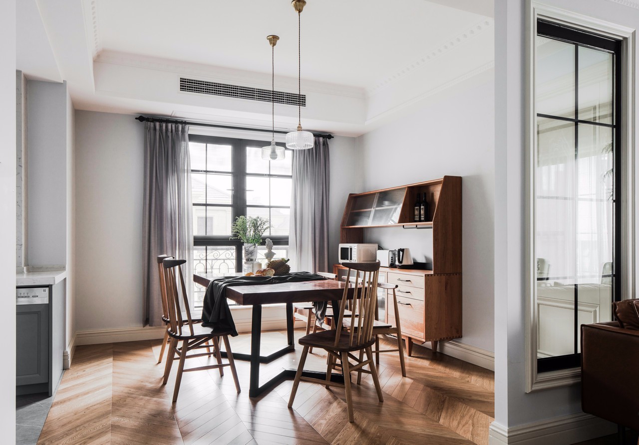 因日常只有三人食用,菜品不會很多,偶爾會有父母做客,滿足房主想要的長行餐桌(正好滿足五人食用,空間不會擁擠) 餐桌后面我又放置了一個儲物柜,色調與餐桌一致,兼顧了美感和平衡感。可以放置很多廚房放不下的東西(滿足房主喜歡東西擺放整齊的要求)
